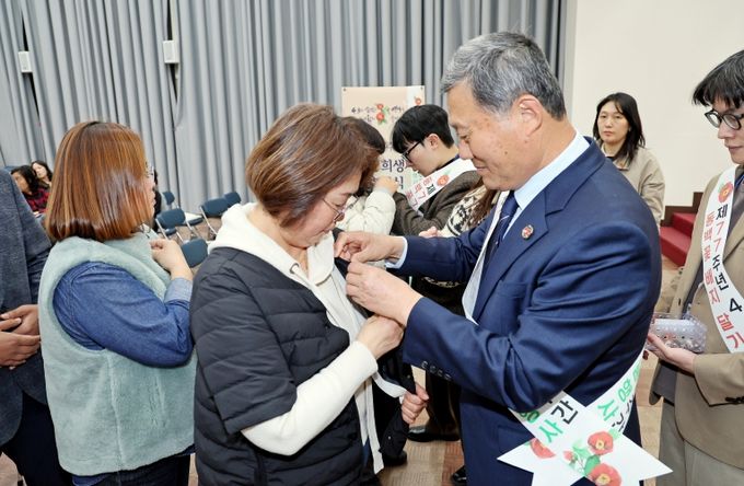 이날 김 시장은 행사에 참석한 이·통 사무장에게 직접 배지를 달아주며 4·3의 아픔과 치유의 기억을 함께 해줄 것을 당부했다.