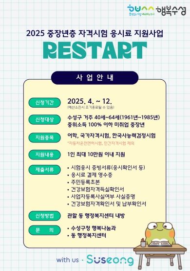 대상자는 신청일 기준으로 수성구에 1년 이상 거주한 40세~64세(1961년생~1985년생)의 중위소득 100% 이하 저소득 중장년 미취업자로, 올해 1월 1일 이후 시험에 응시한 경우라면 합격 여부와 관계없이 신청할 수 있다.