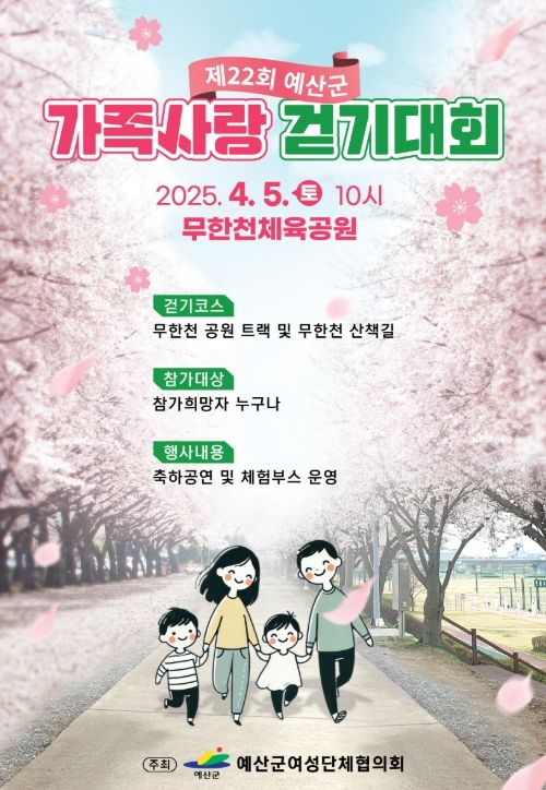 (아름다운교육신문) 예산군은 ‘제22회 가족사랑 걷기대회’를 오는 4월 5일 오전 10시 무한천 체육공원에서 개최한다.