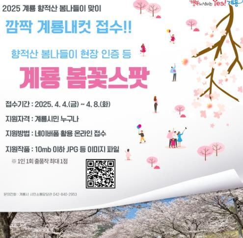 이번 깜짝 접수는 계룡의 봄꽃을 배경으로 한 작품들을 모집하며, 참가자들은 향적산 뿐만 아니라 계룡 전역에서 촬영한 봄 풍경 사진을 자유롭게 응모할 수 있다.