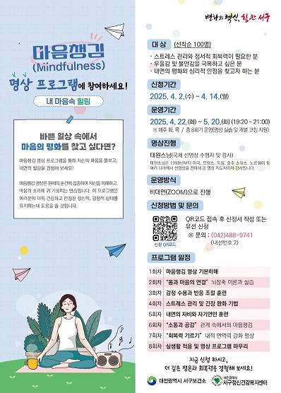 (아름다운교육신문) 대전 서구는 구민들의 스트레스 관리와 내면 힐링을 돕기 위해 마음 챙김 명상 프로그램 신청을 받는다고 이달 31일 밝혔다.