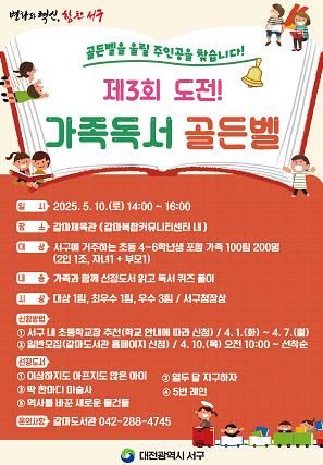(아름다운교육신문) 대전 서구는 4월 1일부터 관내 초등학교 4~6학년 어린이 가족을 대상으로 제3회 ‘도전! 가족독서 골든벨’ 참가자를 모집한다고 밝혔다.