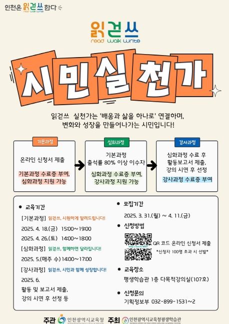 (아름다운교육신문) 인천광역시교육청평생학습관은 3월 31일 오전 10시부터 2025년 읽걷쓰 시민실천가 과정 학습자를 모집한다.