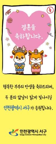 보관함에는 서구를 대표하는 서동이 캐릭터와 함께 “행복한 부부의 탄생을 축하드리며, 두 분의 앞날이 밝게 빛나시길 인천광역시 서구가 응원합니다”라는 따뜻한 축하 문구가 담겨 있다.