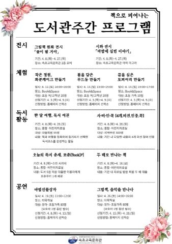 책으로 피어나는 도서관주간 행사와 관련된 자세한 사항은 속초교육문화관 누리집 공지사항을 참고하거나 종합자료실로 문의하면 된다.