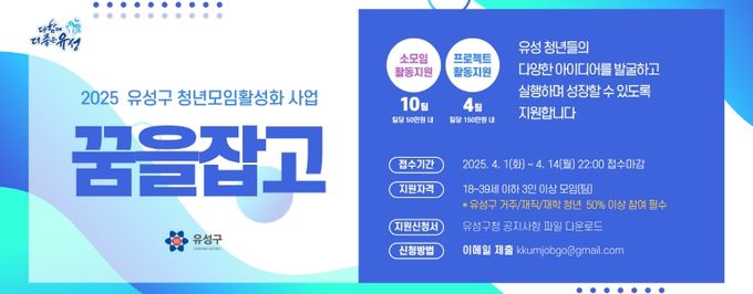 참여를 희망하는 청년 모임은 4월 1일부터 14일까지 이메일로 신청서를 제출하면 된다. 지원 자격 및 선발 기준 등 자세한 내용은 유성구 홈페이지에서 확인할 수 있다.