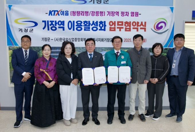 (아름다운교육신문) 기장군은 31일 (사)한국외식업중앙회부산광역시지회기장군지부와 ‘기장역 이용 활성화를 위한 업무협약(MOU)’을 체결하고 KTX-이음(청량리행/강릉행) 기장역 유치에 박차를 가한다고 밝혔다.