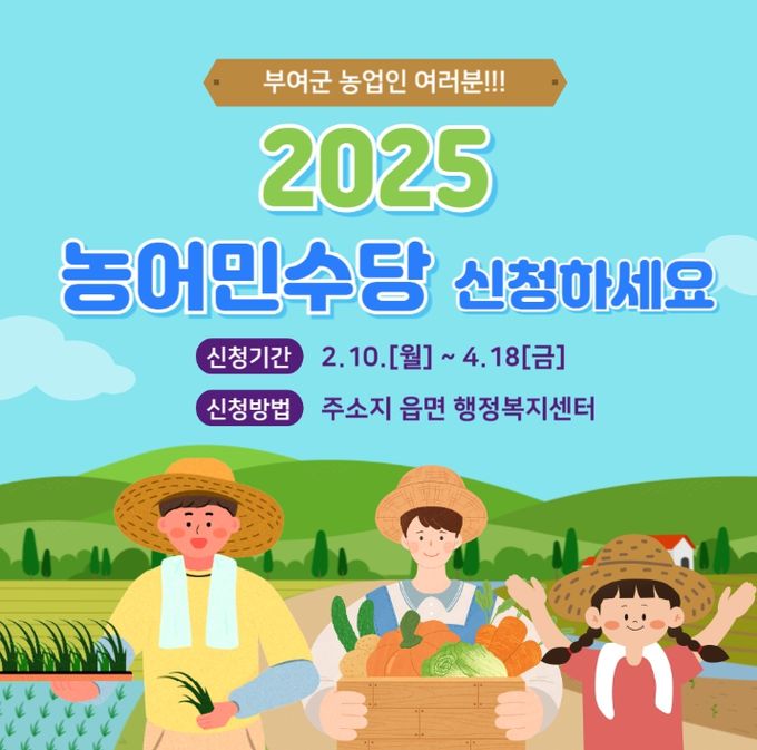 박정현 부여군수는 “농어민수당 지원은 농어업인들의 생활 안정을 돕고, 지역 경제 활성화에도 기여할 것으로 기대된다”라며 “기한 내 신청하여 혜택을 받으시길 바란다”라고 전했다.
