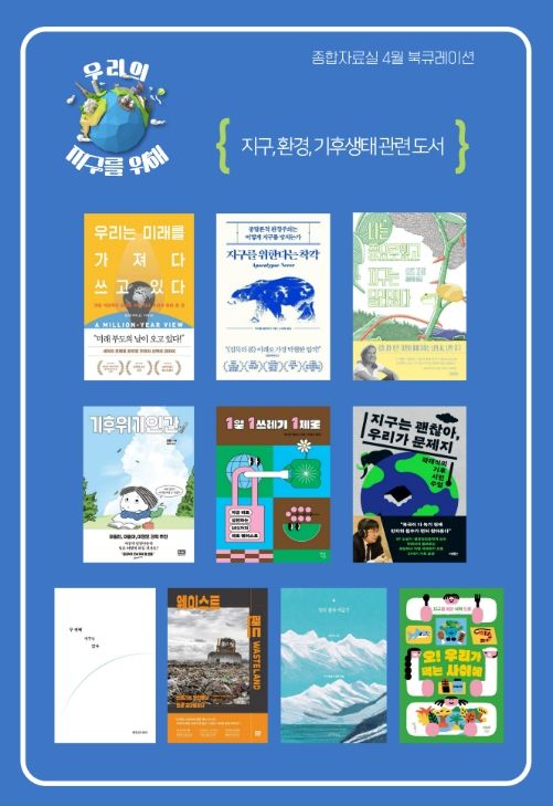 이번 큐레이션은 환경문제와 기후변화에 대한 다양한 시각을 담은 도서를 활용하여 지속 가능한 지구를 위한 실천 방법을 제시한다.