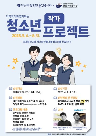 이번 프로그램은 지역 서점 ‘당신의 강릉’, 비영리법인 ‘당신이 잘되면 좋겠습니다’의 청소년 문화 체험 및 인문학 교육사업과 연계 운영되며, △지역 서점 연계 인문학 북 콘서트 △지역 작가와 함께하는 청소년 작가 프로젝트로 구성된다.