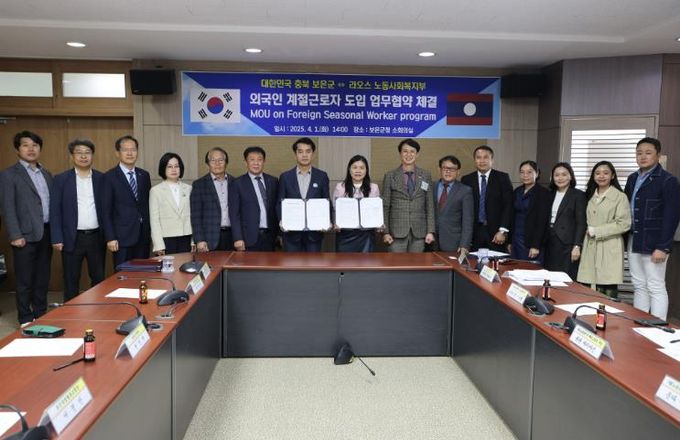 (아름다운교육신문) 보은군은 1일 군청 소회의실에서 외국인 계절근로자 도입을 통한 농촌 인력난 해소를 위해 보은군청 소회의실에서 라오스와 업무협약(MOU)을 체결했다고 밝혔다.