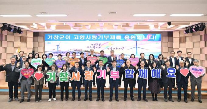 (아름다운교육신문) 거창군은 지난 1일 구인모 군수를 비롯해 전 간부 공무원이 참여하여 3년 차를 맞이한 고향사랑기부제의 성공적인 안착과 기부문화 조성을 위해 고향사랑기부제 응원식을 가졌다.