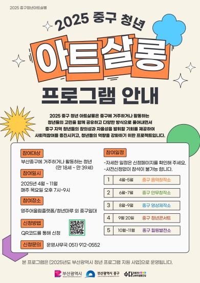 부산시 청년 프로그램 지원 공모사업의 일환인 이번 사업은 중구와 관내 청년단체의 컨소시엄을 통해 청년들의 고민과 생각을 청년 친화적 방식으로 풀어내고 청년의 사회 참여 및 문화‧예술적 역량 강화를 목적으로 진행된다.