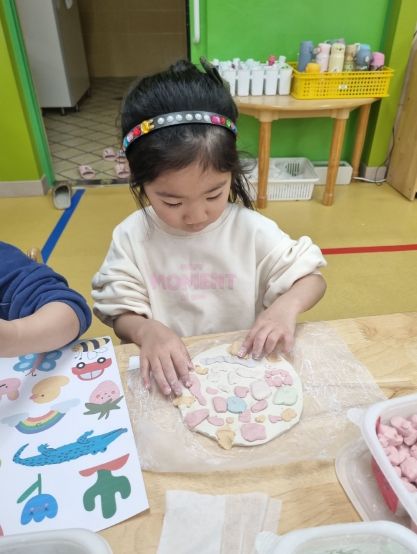 유아들은 자신이 좋아하는 모양을 선택하여 동그란 진흙판 위에 각자 자신이 원하는 색과 모양으로 꾸미기를 했다.