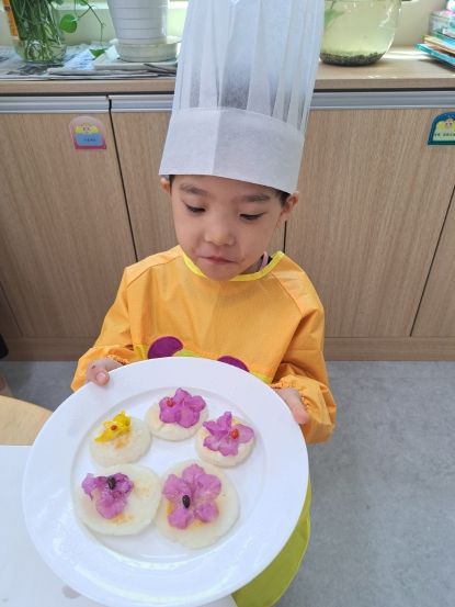 유치원과 일 학년 언니 오빠들이 직접 쌀가루로 반죽도 해보고 예쁜 봄꽃으로 둥근 모양, 위에 예쁘게 꾸며보고 맛있게 구웠다. 여러 모양의 꽃을 올려 자연의 봄을 한 상 가득 교실로 옮겨 놓은 것 같았다.