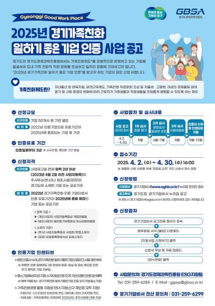 ‘경기가족친화 일하기 좋은 기업 인증사업’은 유연근무제, 근로자 및 배우자 출산 지원, 노동환경 개선 등의 가족친화제도를 도입한 기업을 경기도가 인증하는 정책이다. 도는 가족친화제도를 모범적으로 운영하는 기업이나 공공기관을 선정해 인증하고 유망중소기업인증, 중소기업육성자금 등 다양한 기업지원 사업 신청 시 가점을 부여하는 등 63종의 혜택을 제공하고 있다.