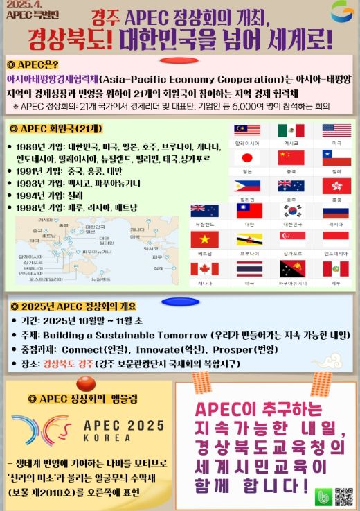 임종식 교육감은 “2025 APEC 정상회의는 세계가 직면한 위기를 극복하고 지속 가능한 미래를 논의하는 중요한 자리”라며, “경북교육청의 세계시민교육 정책과도 밀접한 관련이 있어 교육청에서도 큰 관심을 기울이고 있다”라고 말했다.