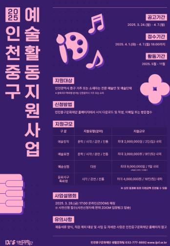 (아름다운교육신문) (재)인천중구문화재단은 인천 중구에 거주 또는 소재하는 예술인 및 예술단체의 창작과 활동을 지원하기 위한 '2025 인천 중구 예술 활동 지원사업'을 추진한다고 2일 밝혔다.