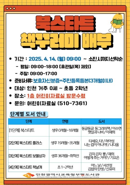 책꾸러미는 165명에게 선착순 배부되며, 수령을 원하는 보호자는 신분증과 3개월 이내 발급된 등본을 지참하여 부평도서관 1층 어린이자료실을 방문하면 된다.