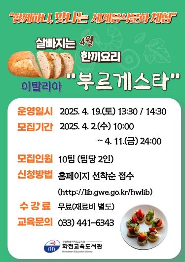 화천교육도서관 류은선 관장은 “이색적 요리와 다양한 문화 체험을 다룬 이번 특강으로 참가자들의 다문화에 대한 공감과 이해 폭이 넓혀지길 바란다”라고 밝혔다.