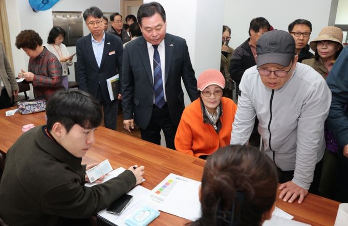 (아름다운교육신문) 김산 무안군수는 2일 무안읍 휴먼시아 아파트를 방문해 이날부터 지급을 시작한 민생회복지원금 배부 현장을 점검했다.