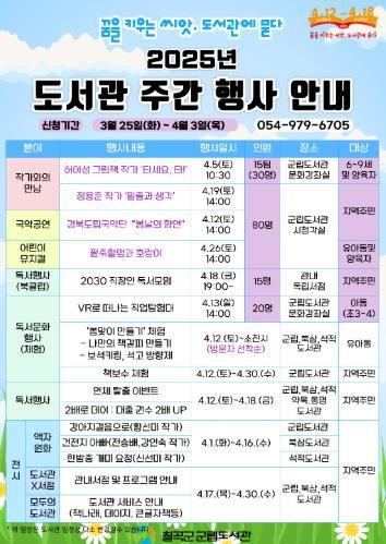 (아름다운교육신문) 칠곡군 군립도서관은 ‘도서관의 날․도서관 주간’을 맞아 4월 한 달간 “꿈을 키우는 씨앗, 도서관에 묻다”를 주제로 도서관의 가치와 역할을 알리고, 지역 주민들이 독서문화를 향유할 수 있도록 다양한 행사를 운영한다.