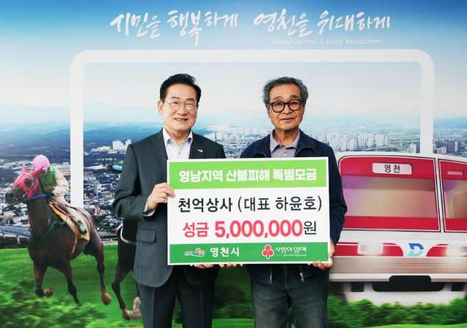 최기문 영천시장은 “산불로 피해를 입은 주민들을 위해 성금을 기부해주신 천억상사, 덕암공단협의회, 동부동 통장협의회, 여성기업인협의회 영천지회에 진심으로 감사드린다”며, “산불피해를 입은 이웃들의 일상이 하루빨리 회복되기를 바라며, 영천시도 필요한 지원을 아끼지 않겠다”고 전했다.
