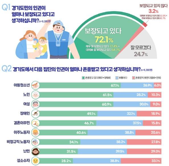 여론조사 결과 응답자의 72.1%는 경기도민으로서 인권이 보장되고 있다고 응답했다. ‘보장되고 있지 않다’는 3.2%에 그쳤다.