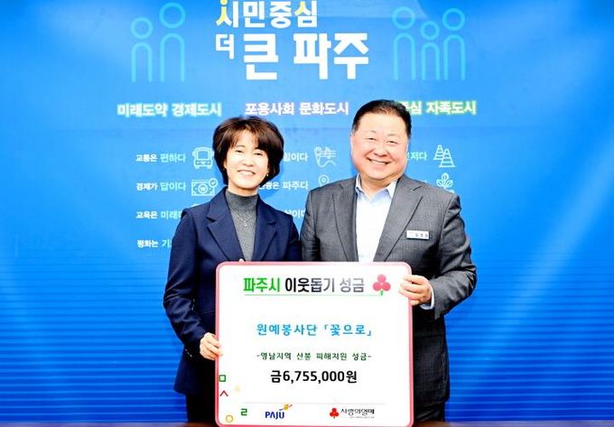(아름다운교육신문) 파주시는 영남지역 산불로 발생한 피해를 지원하기 위한 기부 행렬이 이어지고 있다고 밝혔다. 장어명가 지중해로부터 1천만 원, ㈜그린휀스로부터 1천만 원, 원예봉사단체 ‘꽃으로’로부터 675만 원을 기부받았다.