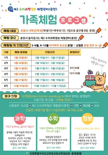 (아름다운교육신문) 강원특별자치도교육청교육과학정보원은 미래를 여는 더 나은 교육과 행복한 삶을 위해 제1~3 수리과학정보 체험센터(원주, 춘천, 동해)에서 과학, 수학, 정보 교과 기반 체험형 주말 가족프로그램을 운영한다.