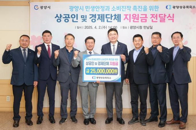지원금은 총 2천 5백만 원 규모이며, 소비 촉진과 지역 경제 활성화를 위해 ▲광양상공인회 ▲광양만상공인회 ▲동광양상공인회 ▲광영상공인연합회 ▲광양경제활성화운동본부에 각각 5백만 원이 전달됐다.