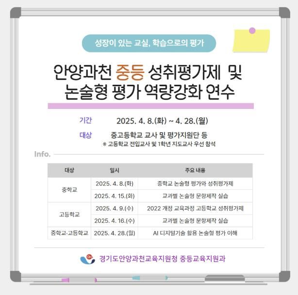 (아름다운교육신문) 경기도안양과천교육지원청은 2022 개정 교육과정 적용 및 중등 성취평가제 시행에 발맞춰, 선제적으로 학교(교원)의 평가역량 강화를 위한 연수를 계획하여 4월 8일부터 한 달간 집중할 예정이다.