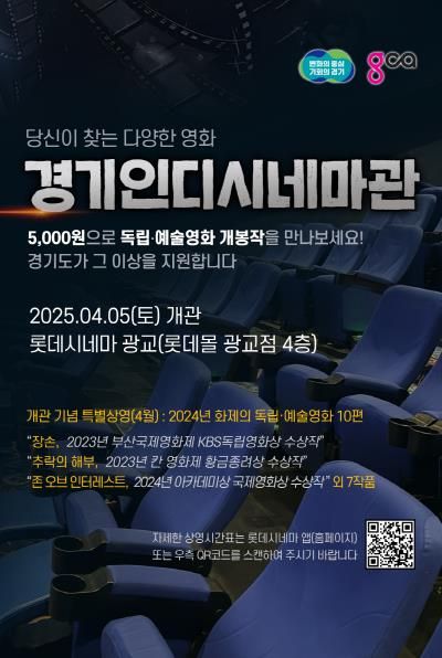 (아름다운교육신문) 경기도가 4월 5일 롯데시네마 광교 1관(롯데몰 광교점 4층)에 독립·예술영화전용관인 ‘경기인디시네마관’을 개관한다.