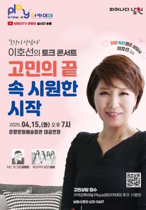 (아름다운교육신문) 남원시는 15일 저녁 7시, 춘향문화예술회관 대공연장에서 국내 최고의 심리 상담 전문가이자 화끈하고 통쾌한 솔루션으로 화재를 몰고 있는 호랑이 상담사 이호선 교수를 초청하여 Play남원 아카데미 토크 콘서트 “고민의 끝, 속 시원한 시작”을 개최한다.