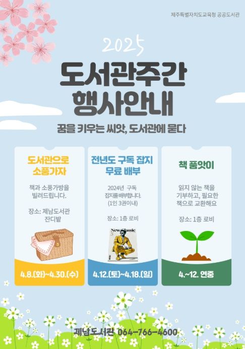 (아름다운교육신문) 제주도교육청 제남도서관은 오는 12일부터 도서관의 날(4월 12일)과 도서관 주간(4월 12일~18일)을 맞아 지역 주민들이 도서관에서 즐길 수 있는 다양한 독서 문화 행사를 운영한다.