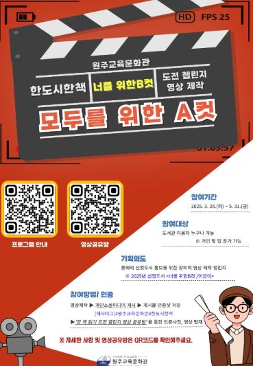 (아름다운교육신문) 원주교육문화관은 3월 25일부터 5월 31일까지 원주 한 도시 한 책 읽기 운동의 일환으로 ‘한 책 읽기 도전 챌린지 영상 제작 모두를 위한 A컷’을 운영한다.