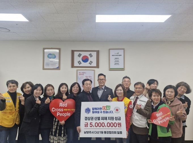 (아름다운교육신문) 남양주시 다산1동 통장협의회는 4일 최근 경북지역 등 산불 피해로 어려움을 겪고 있는 이재민들을 돕기 위해 대한적십자사 경기지사에 성금 500만 원을 기탁했다.