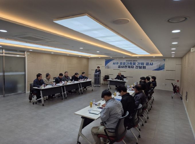 이번 간담회에는 서구청 건축주택과장, 시설팀장, 공사관계자 등 총 17명이 참석해, 관내 공공건축물 건립 추진 현황을 공유하고 공정률 제고 방안과 공사장 안전 대책에 대해 논의했다. 또한 각 공사 현장에서 겪고 있는 애로사항을 청취하며 실질적이고 내실 있는 논의가 이루어졌다.