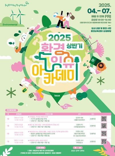 (아름다운교육신문) 충청북도교육청 환경교육센터와우에서 4월부터 7월까지 매월 두 번째주 금요일마다 '2025학년도 상반기 환경잇슈아카데미'를 운영한다고 밝혔다.