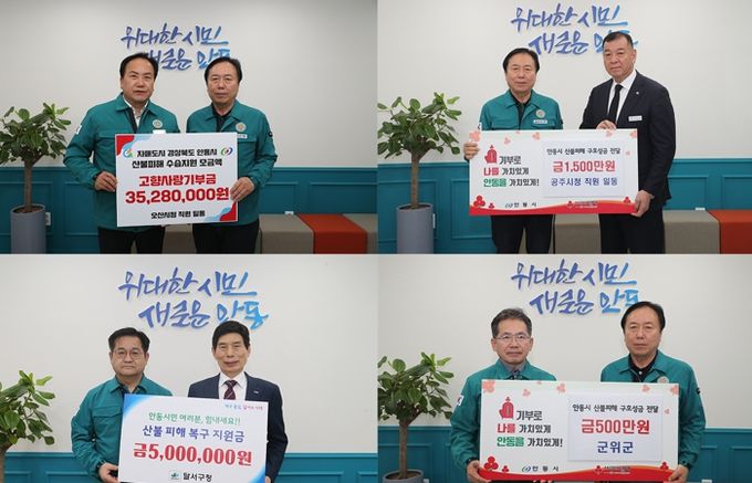 권기창 안동시장은 “이번 성금은 단순히 금전적 지원을 넘어, 우리에게 큰 힘과 희망을 주는 메시지로 다가온다”며 “보내주신 성금은 피해 주민들의 주택 복구와 생계 지원, 심리적 회복을 위한 프로그램 등 다양한 분야에 사용될 예정이며 모든 시민이 빠르게 일상으로 돌아갈 수 있도록 최선을 다하겠다”고 전했다.