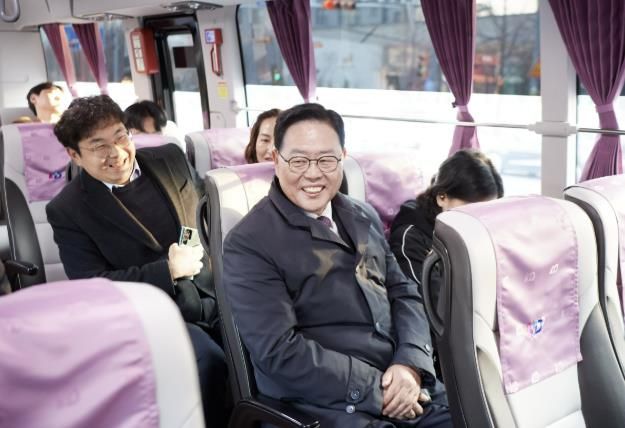 강수현 양주시장이 이른 아침부터 시민들과 함께 첫차에 직접 탑승해 교통 여건을 살피고 있는 모습이다.