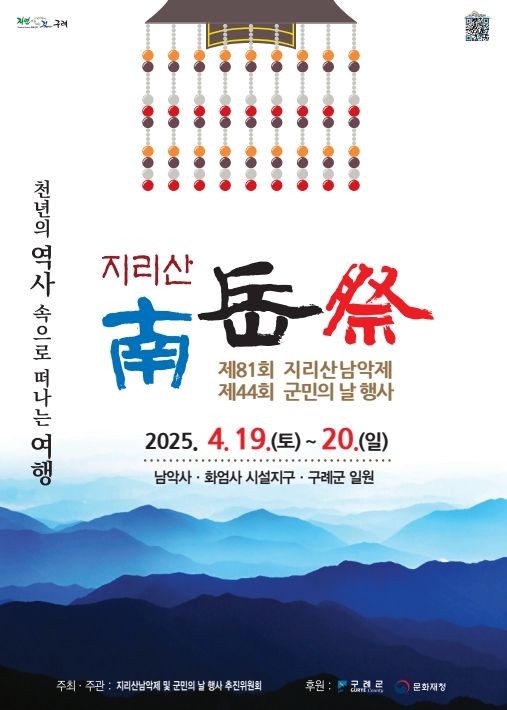 (아름다운교육신문) 구례군은 오는 4월 19일부터 20일까지 ‘천년의 역사 속으로 떠나는 여행’이라는 주제로 남악사 및 화엄사 시설지구, 공설운동장 등 구례군 일원에서 '제81회 지리산남악제 및 제44회 군민의 날 행사'를 개최한다고 밝혔다.