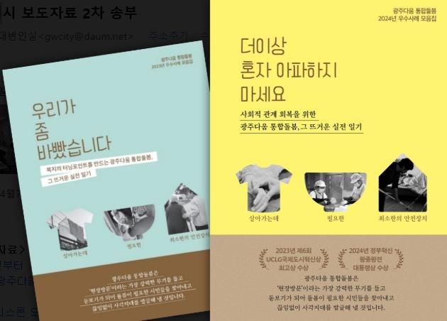 ▲비 오는 날에도 마음 놓고 주무세요 ▲배달 죽 하나로 며칠을 버텼는데, 이제 살 것 같아요 ▲옆집에 도움이 필요해 보여요 ▲정말 오랜만에 산책을 나왔는데 볕이 참 좋네요 ▲어서 와, 보고 싶었어! 등 광주다움 통합돌봄으로 위기를 넘어 일상을 되찾고 건강을 회복한 시민들과 이들에게 도움을 준 관계자들의 가슴 따뜻한 이야기가 기록돼 있다.
