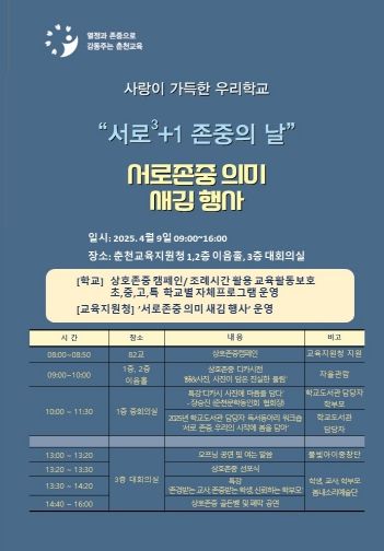 (아름다운교육신문) 춘천교육지원청에서는 오는 4월 9일 관내 학교와 춘천교육지원청에서 ‘사랑이 가득한 우리 학교, 서로3+1 존중의 날’ 행사를 개최한다.