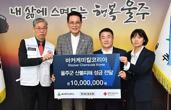 (아름다운교육신문) (사)바커케미칼코리아가 7일 울주군청 소회의실에서 이순걸 군수, (사)바커케미칼코리아 장성민 울산 공장장 등 관계자들이 참석한 가운데 울주군 산불 피해 성금 1천만원을 전달했다.