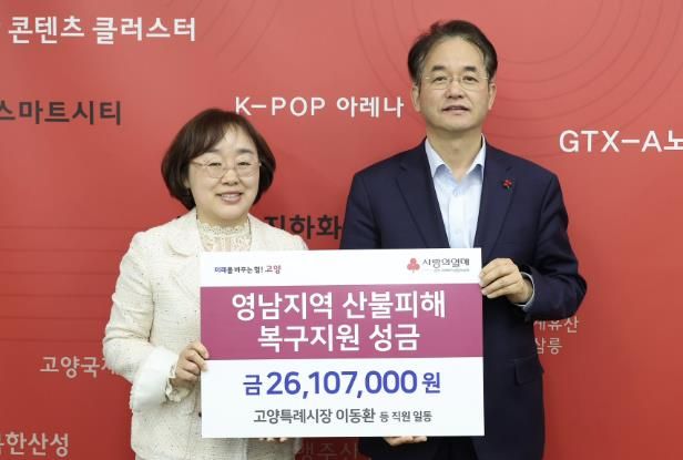 이번 성금은 최근 대형 산불로 고통을 겪고 있는 경북·경남 지역 주민들을 위로하고 피해 복구를 돕기 위해 고양시 소속 직원 909명의 자발적 참여로 마련됐다.