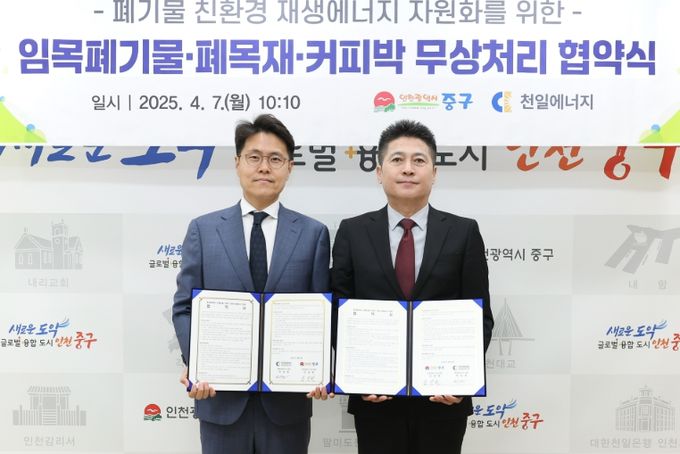 이를 위해 김정헌 인천 중구청장과 박상원 ㈜천일에너지 대표는 지난 7일 중구청 구청장실에서 이 같은 내용을 골자로 한 ‘폐기물 친환경 재생에너지 자원화 업무협약’을 체결했다.