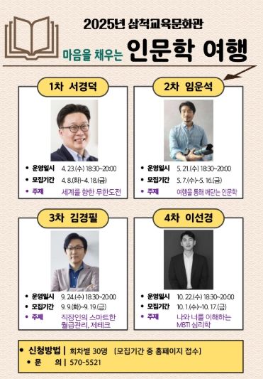 삼척교육문화관 김범중 관장은 “마음을 채우는 인문학 여행으로 우리 삶에 깊은 생각과 의미를 부여하는 동시에, 서로의 생각을 공유하며 성장하는 시간이 되길 바란다”고 전했다.