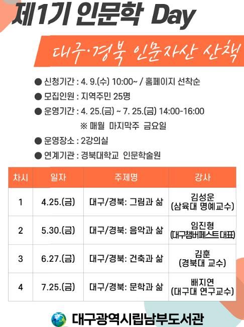 (아름다운교육신문) 대구남부도서관은 4월 25일부터 7월 25일까지 매월 마지막 주 금요일 오후 2시부터 제2강의실에서 운영될 예정인 ‘제1기 인문학 Day, 대구·경북 인문자산 산책’과정의 참가자를 모집한다.