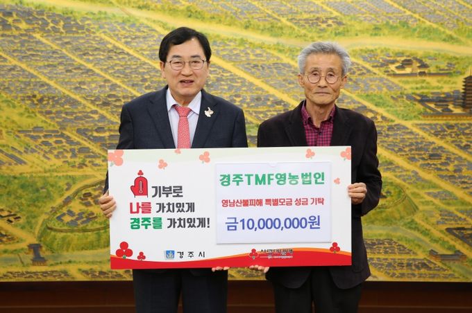주낙영 경주시장은 “매년 나눔을 실천해주시는 경주 TMF영농법인에 깊이 감사드린다”며, “보내주신 성금은 이재민들의 삶의 터전을 복구하는 데 소중히 사용하겠다”고 전했다.